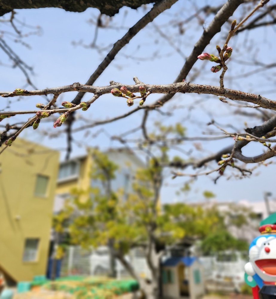 園庭の桜もつぼみが膨らんで、ゆっくりと咲いています