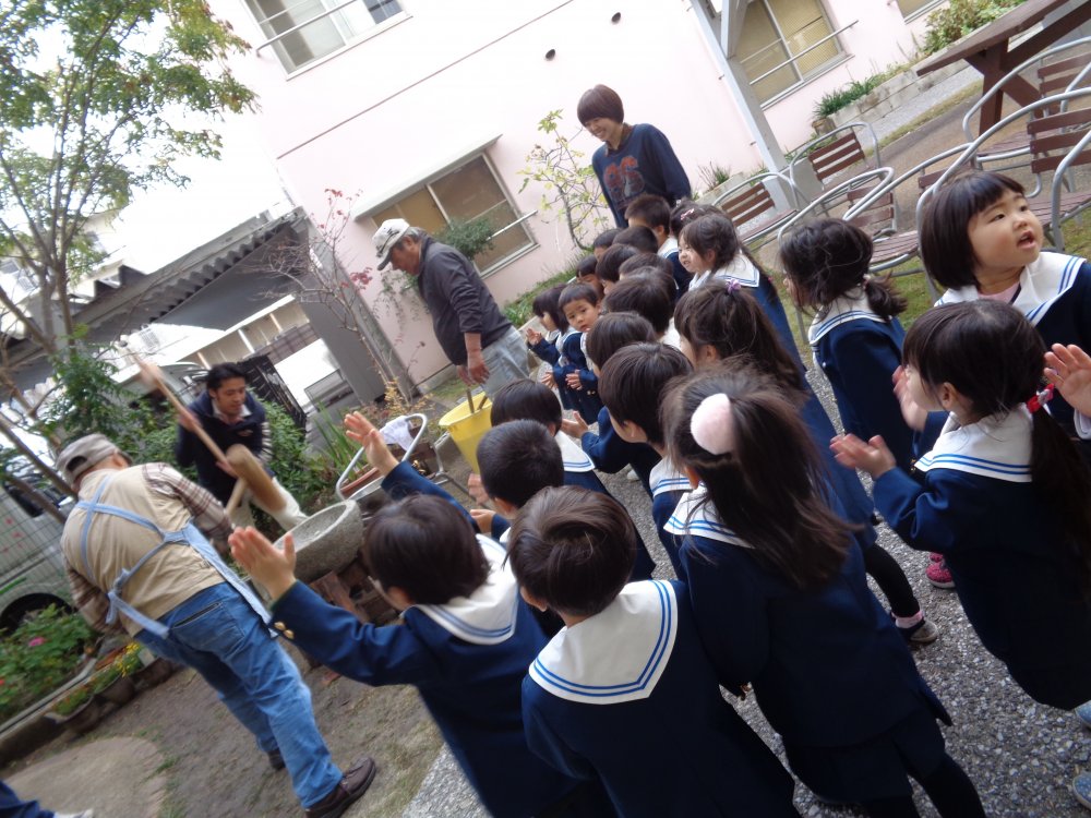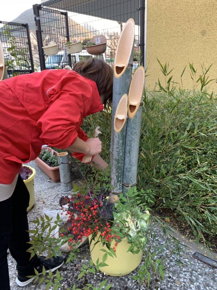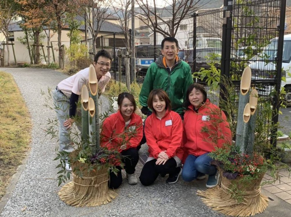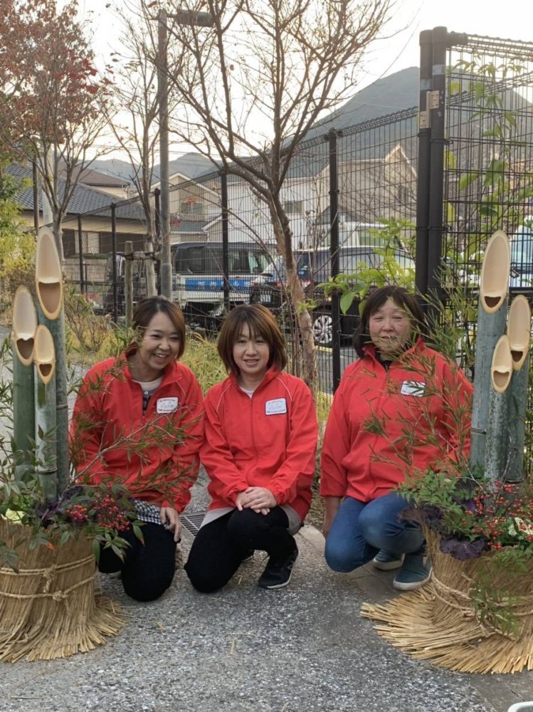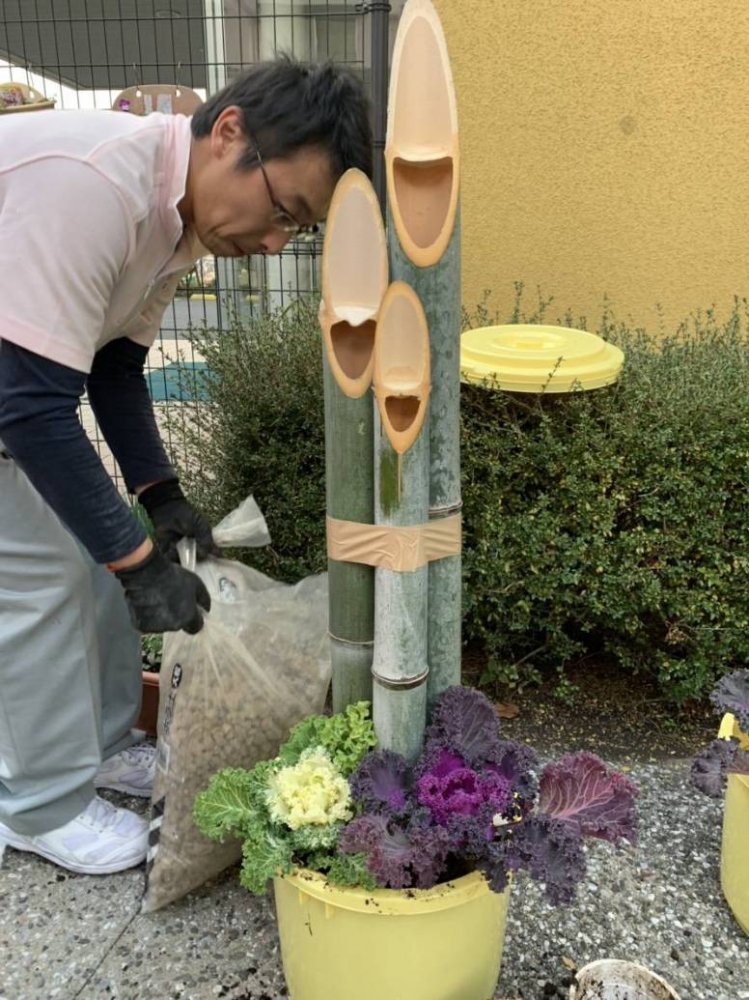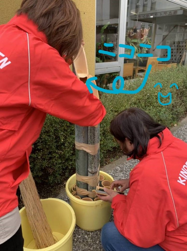 お隣の、老健施設桜丘さんが門松を手づくりされていたところ、たまたま2階の教室の大掃除をしていた先生たちが思わず窓から