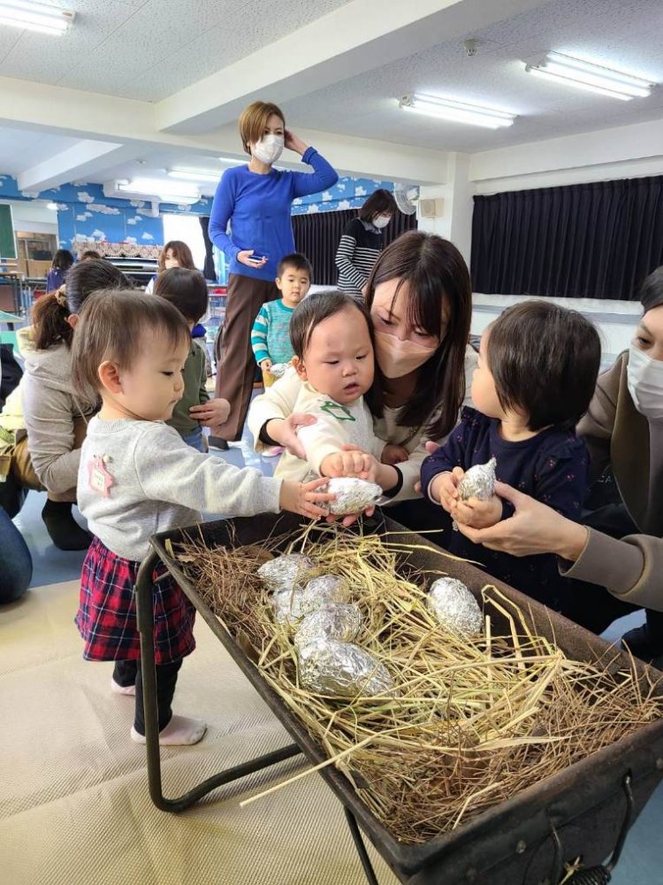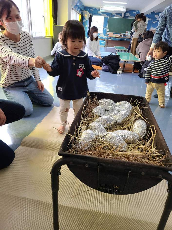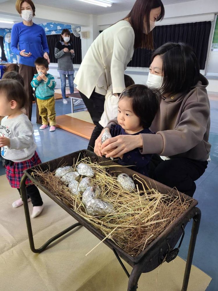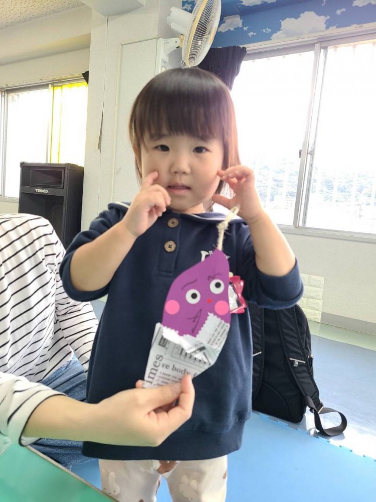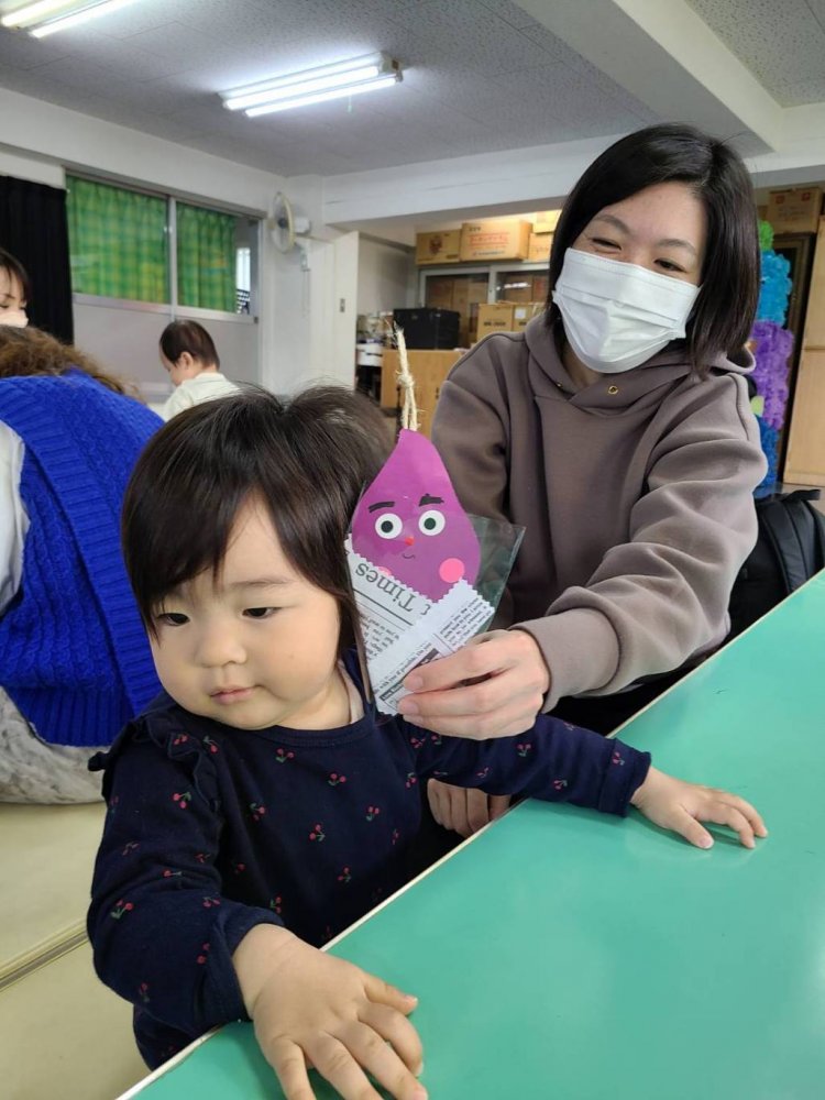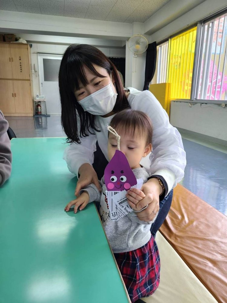 個性的な可愛いお芋ちゃんの壁飾りと、ホカホカの焼き芋を持ち帰り、